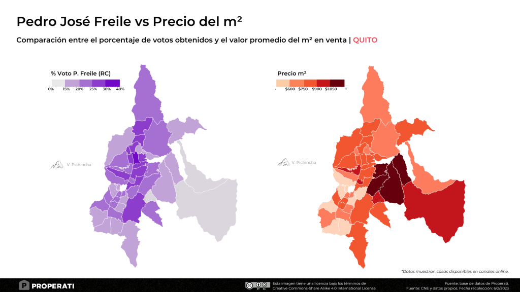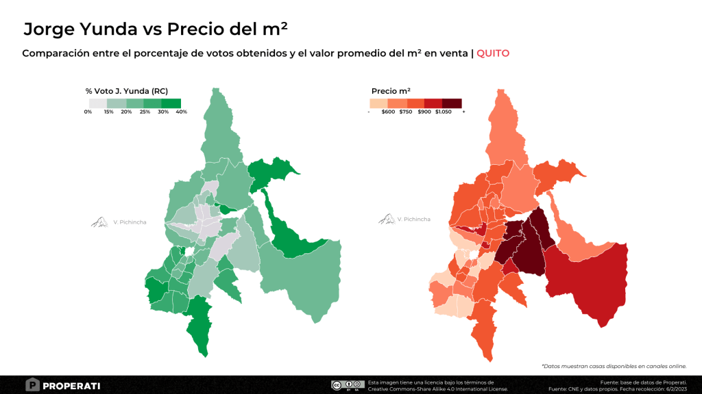 This analysis explores the relationship between two key variables: housing prices and the percentage of votes received by each mayor candidate in the 2023 Quito City Council elections. The study reveals a clear correlation between political orientation and housing prices, with left-leaning candidates performing better in lower-priced areas, while right-leaning candidates received stronger support in higher-priced neighborhoods. The findings are visually represented through a series of maps, illustrating the distribution of votes for each candidate alongside housing price data, offering insights into how socio-economic factors influence voting patterns across the city.